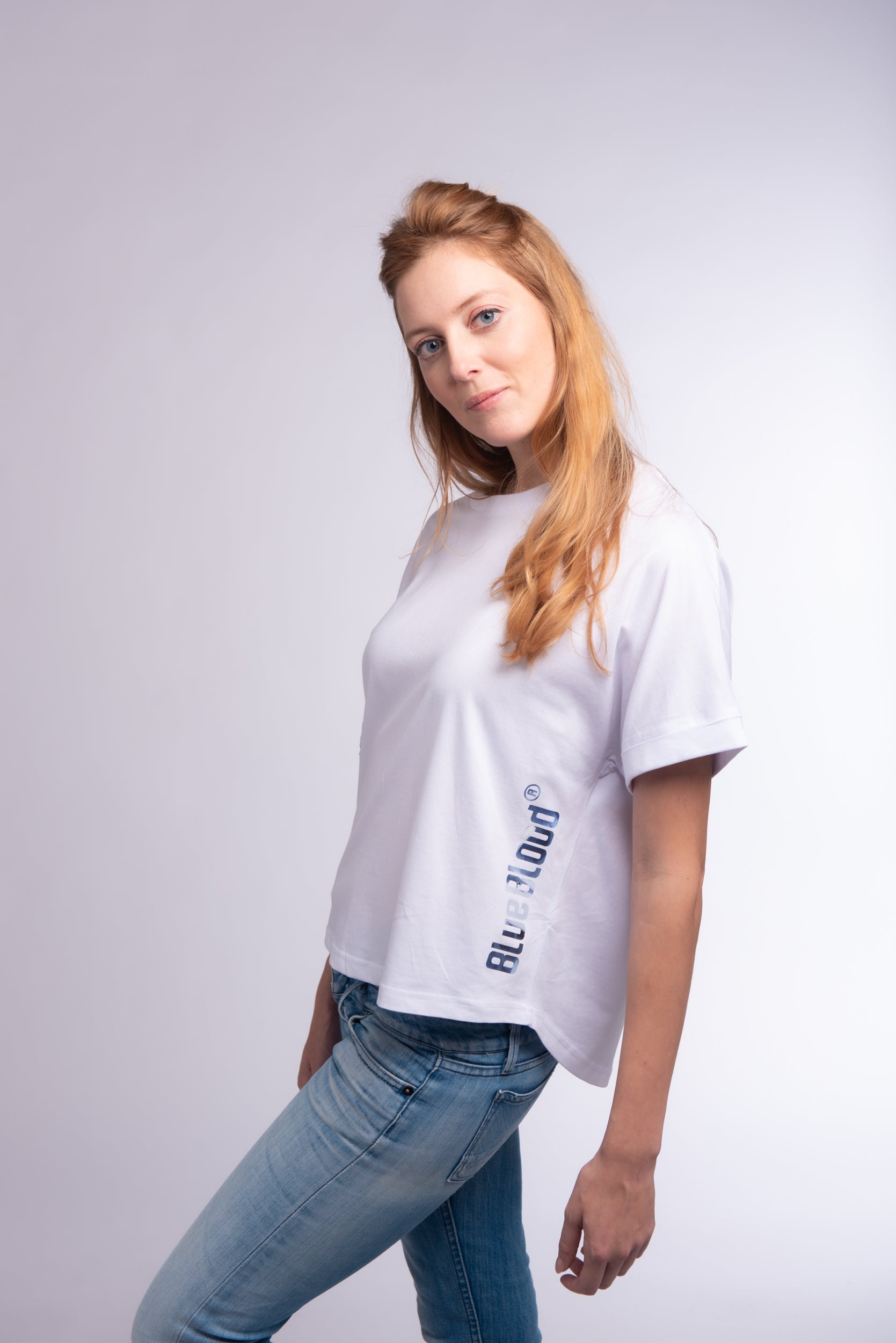 Übergroßes T-Shirt mit hochgekrempelten Ärmeln. Weiß